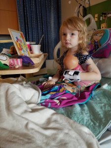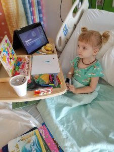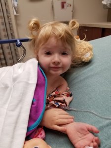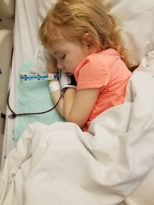 Soon after all this, we were finally able to get back with Rowan’s GI doctor and catch her up with everything that had been happening. The next morning I received a phone call from her nurse. I was informed that Rowan’s hemoglobin level was dangerously low and I needed to take her to the hospital immediately for a blood transfusion. What??! My poor baby needs blood?! Before I knew it, we were back in the ER, being admitted to the hospital again, but this time our girl was receiving blood. It was such an odd sight, seeing someone else’s blood going into my three-year-old daughter. I was suddenly very thankful for all the people who donate blood.